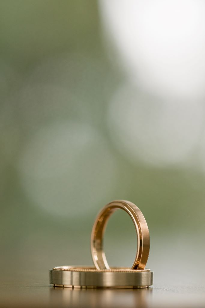 お互いにデザインと色ともに好みがかなり異なっていたため、リンクさせるために新郎の提案で土台の金属だけ新婦が選んだピンクゴールドを取り入れることでリンクさせることになりました。